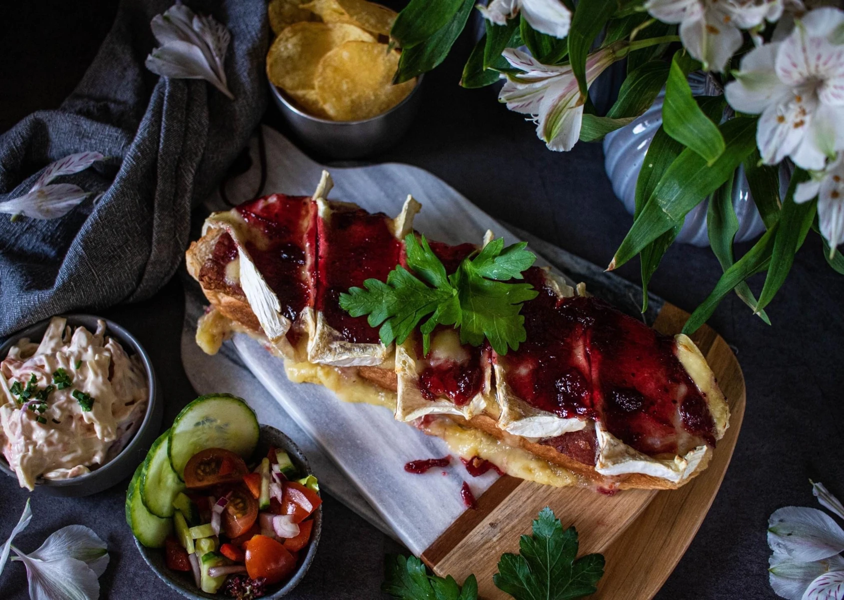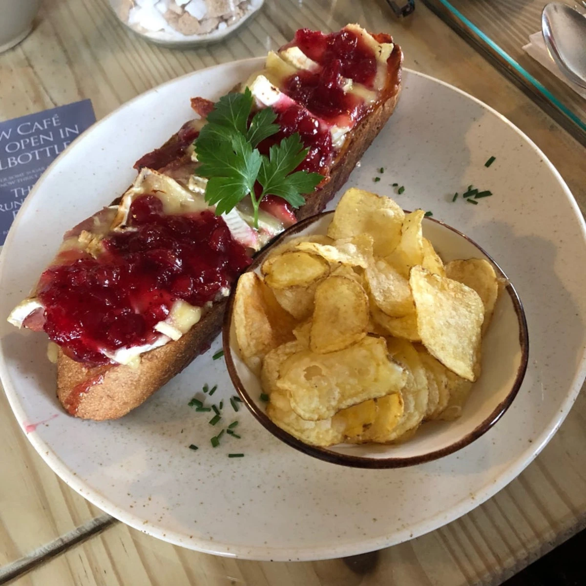 A chunky slice of Artisan white, wholemeal or free-from gluten bread, topped with lovely stuff and melted under the grill. Yummy!
