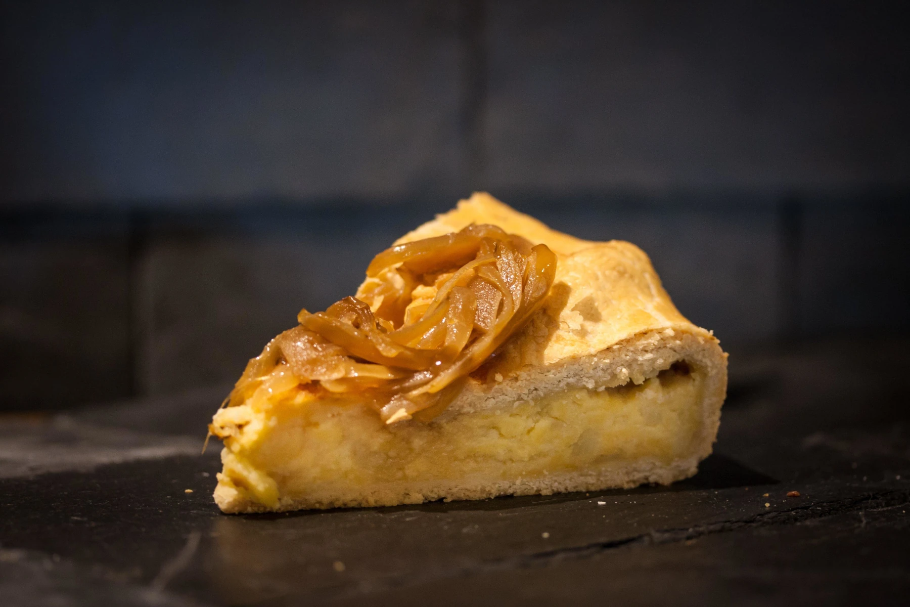Handmade in Northumberland. A traditional local recipe filled with cheese, potato and seasoning encased in delicious shortcrust pastry and then generously topped with caramalised onions.